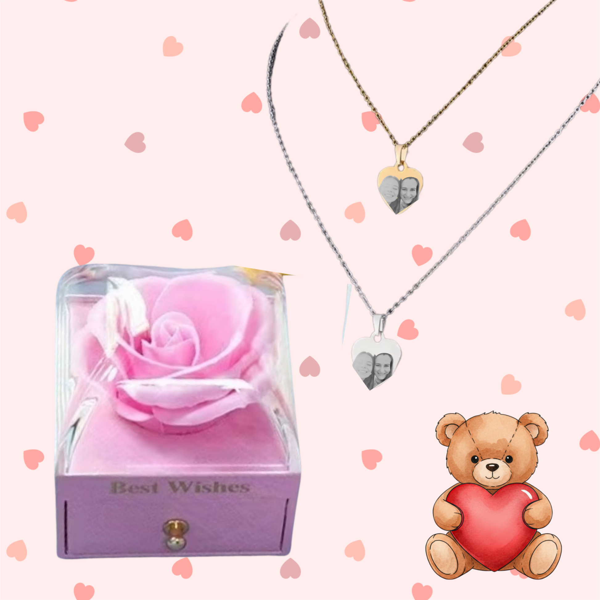 Contém uma caixa com uma rosa perfumada e um colar em aço inoxidável, personalizado com nomes ou iniciais de uma face e uma foto do casal, do outro lado.
