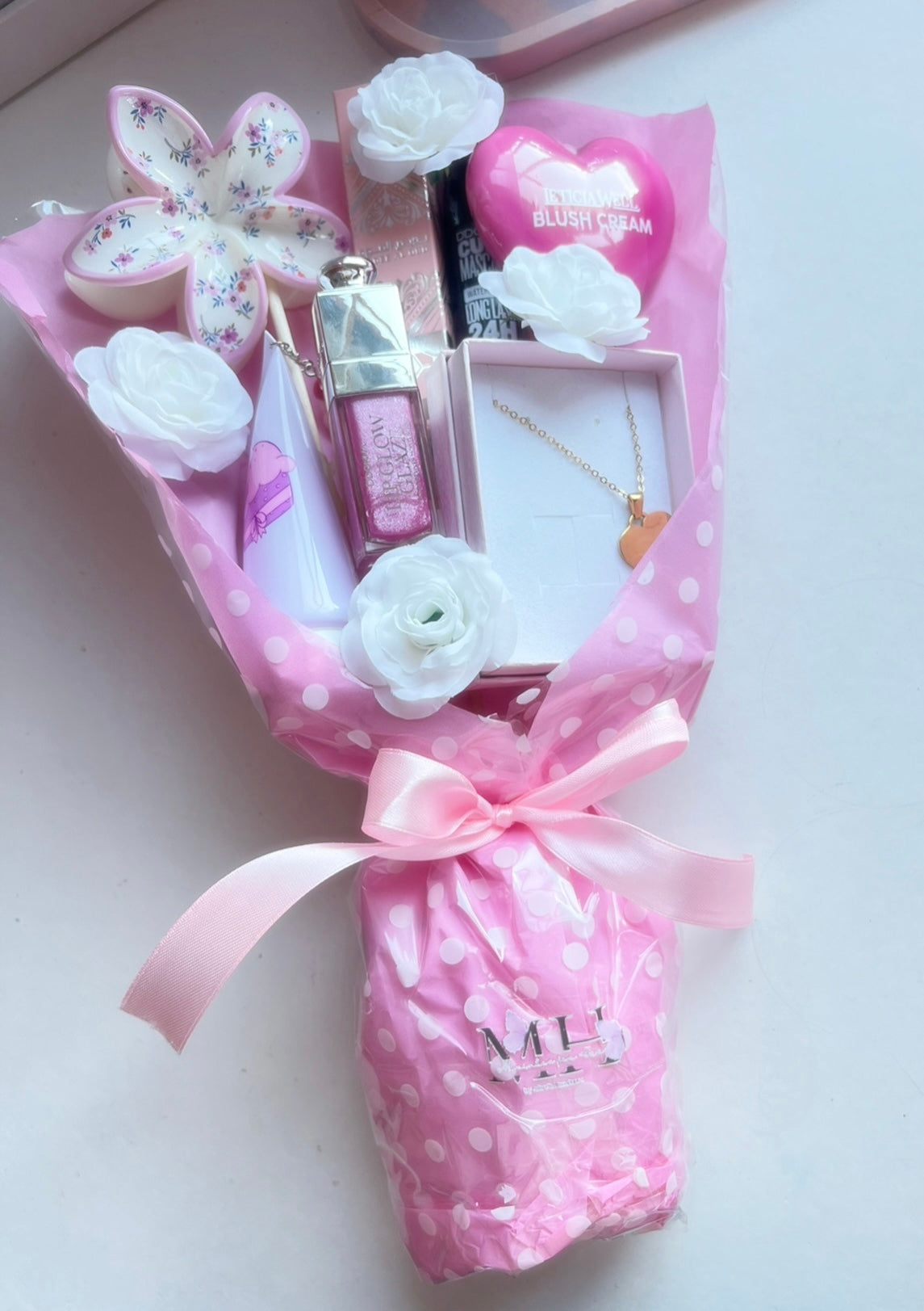 Contém um colar personalizado, uma mola para cabelo, um blush, um Mini perfume árabe, um gloss iluminador, um creme de mãos e uma máscara de pestanas (tudo separado tem o valor total de 45,80€) 🫀