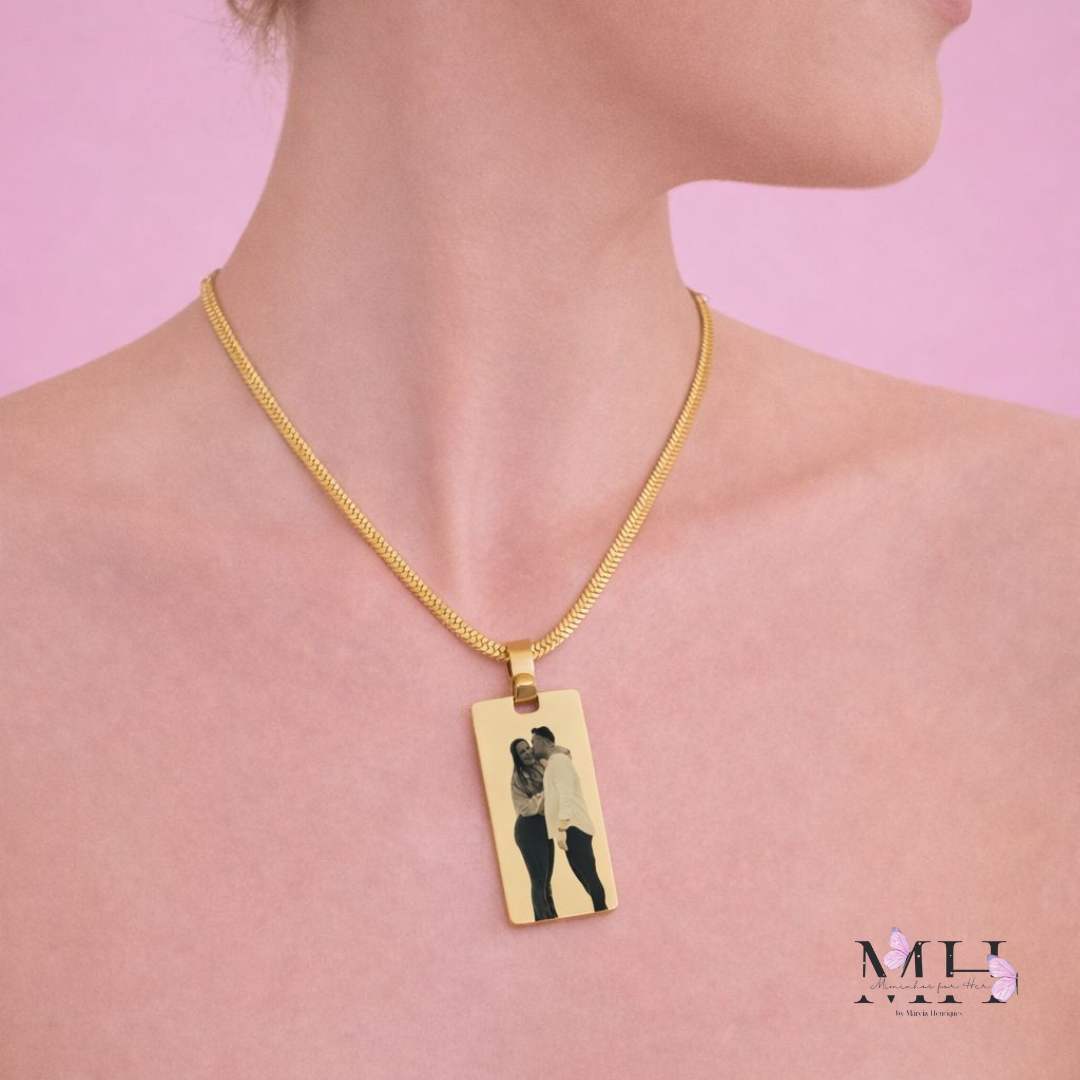 Este colar personalizável permite-te adicionar fotos especiais de família, amigos ou da tua cara-metade, criando uma peça única e cheia de significado.